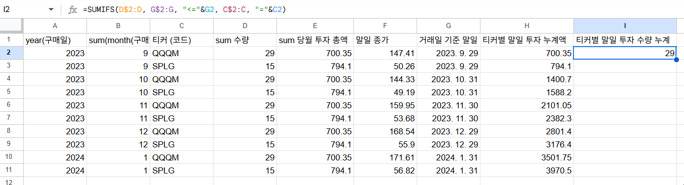 I1 셀에 "티커별 말일 투자 수량 누계"를 작성하고 I2 셀에 아래와 같이 함수를 입력합니다.