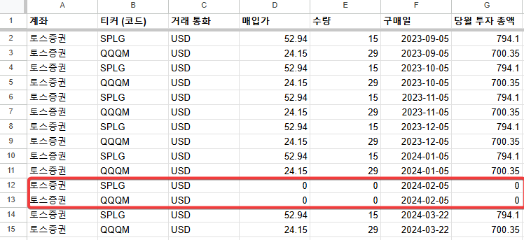 그럴 때는 "주식 투자 매입 리스트" 시트에 매입 중인 티커 별로 0원을 매입했다는 기록을 추가해주시면 됩니다.